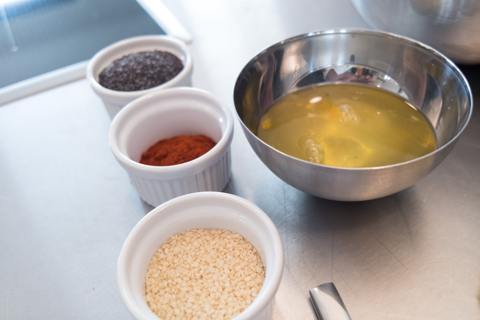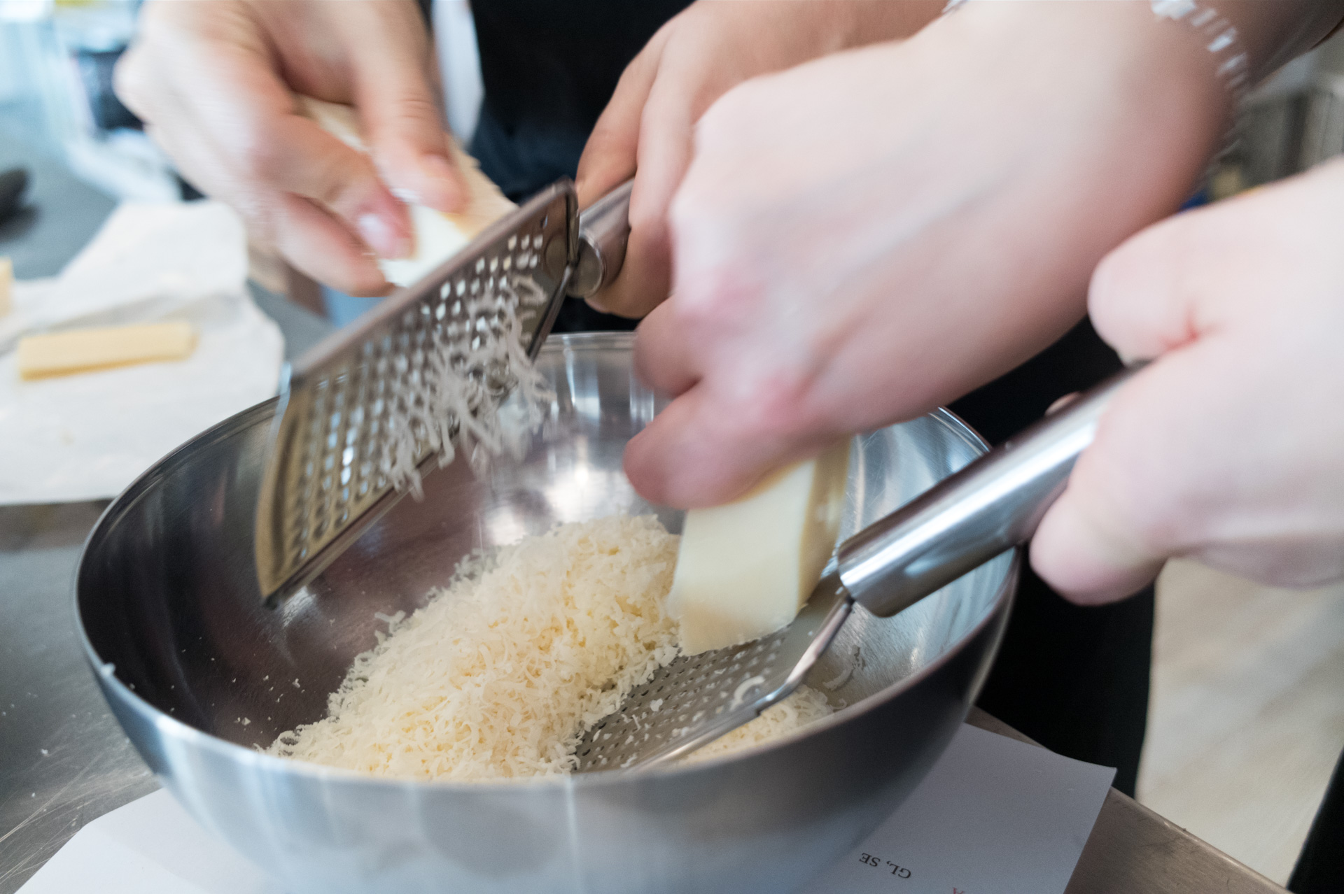 Während der Kühlpause wagen wir uns an unser nächstes Rezept: die Cracker. Als erstes ist hier Muskelkraft und Ausdauer gefragt, denn eine riesige Menge Hartkäse muss fein geraspelt werden. Nach diesem Kraftakt fehlen nur noch die übrigen Zutaten. Zum Schluss können nach Belieben verschiedene Geschmackskomponenten (zum Beispiel Mohn, Paprikagewürz und Sesam) hinzugefügt werden, um ein individuelles Aroma zu erhalten.