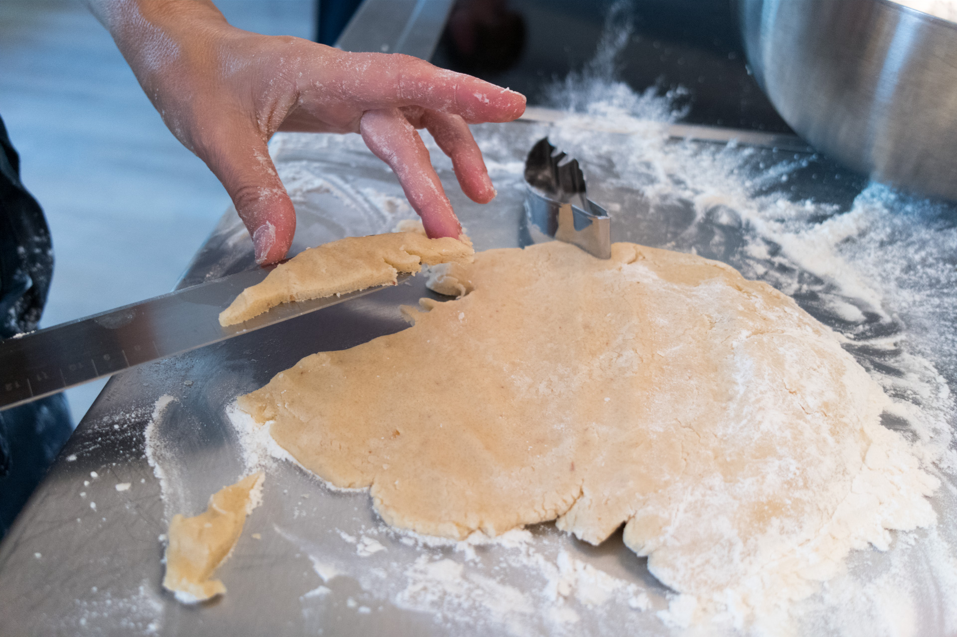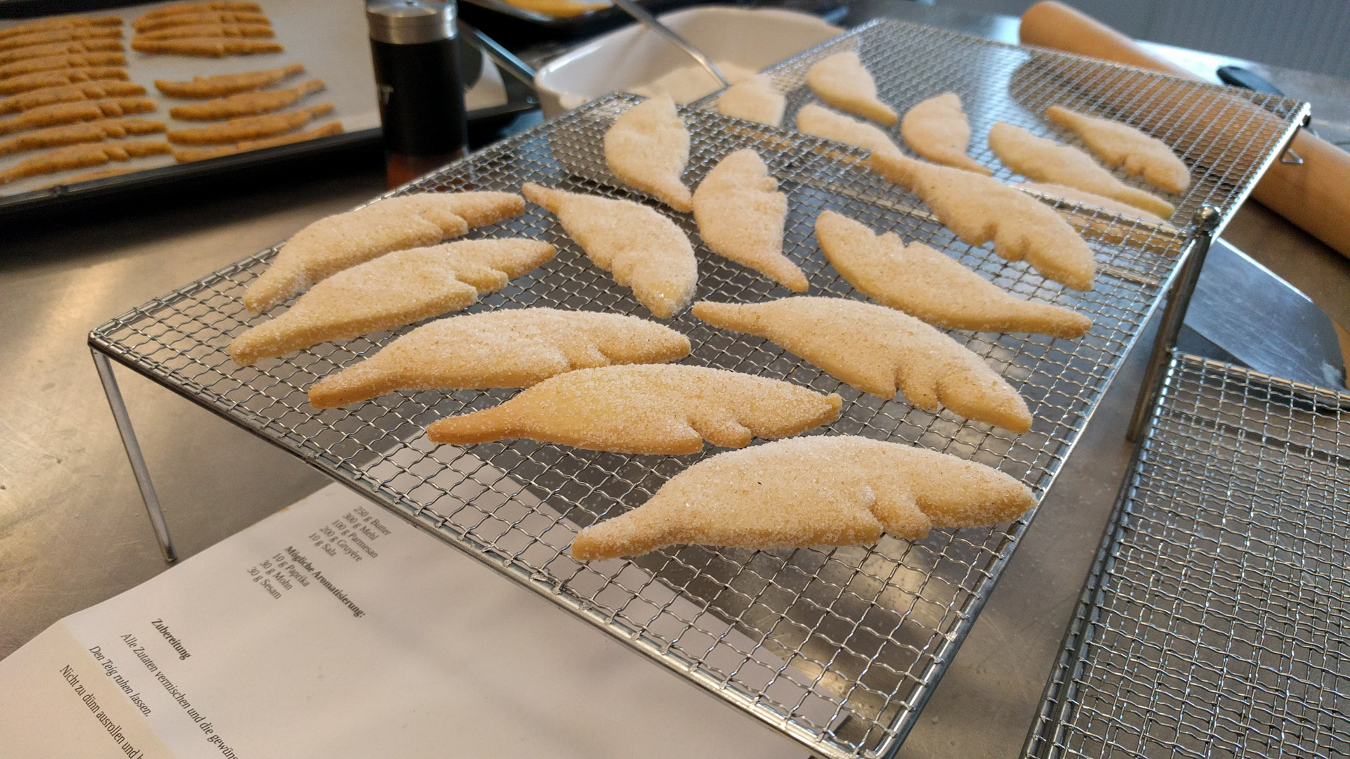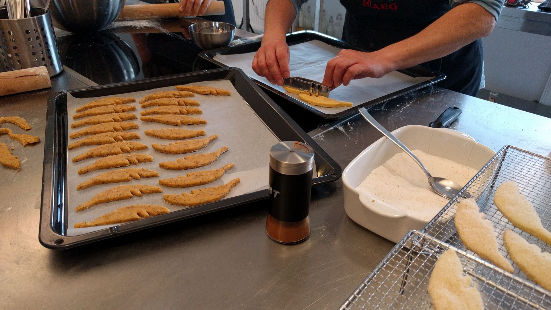 Beim Mixen fällt uns allerdings auf, dass irgendwas mit der Konsistenz von unserem Teig nicht stimmen kann und komischerweise steht da auch noch eine ganze Schale voll Zucker, die doch eigentlich schon längst in der Schüssel sein soll. Mutig probiert Sandra und ihr Gesicht sagt alles: Der vermeintliche Zucker in unserem Teig enttarnt sich als Salz. Nachdem wir herzlich gelacht haben, starten wir unseren zweiten Versuch. Diesmal sieht unser Teig aus wie aus dem Bilderbuch und unsere Kekse können nach einer Kühlpause ausgestochen, mit Marmelade und Eigelb bestrichen und in den Ofen gebracht werden.