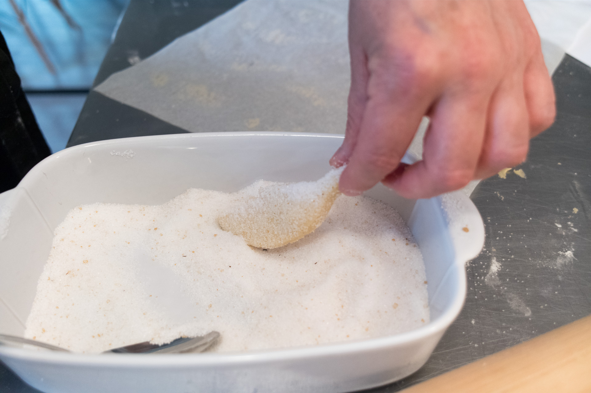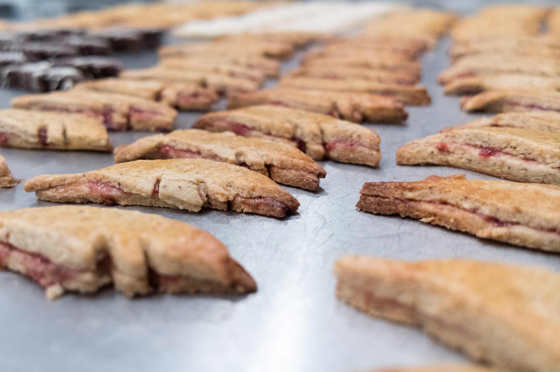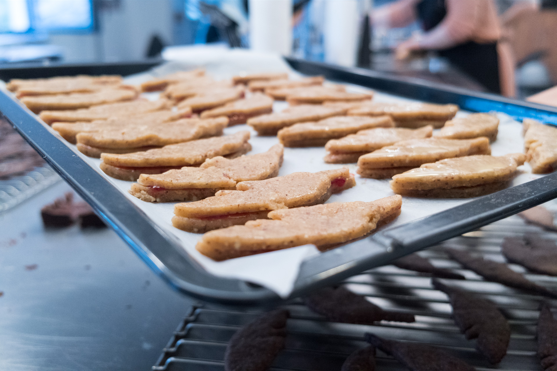 Beim Mixen fällt uns allerdings auf, dass irgendwas mit der Konsistenz von unserem Teig nicht stimmen kann und komischerweise steht da auch noch eine ganze Schale voll Zucker, die doch eigentlich schon längst in der Schüssel sein soll. Mutig probiert Sandra und ihr Gesicht sagt alles: Der vermeintliche Zucker in unserem Teig enttarnt sich als Salz. Nachdem wir herzlich gelacht haben, starten wir unseren zweiten Versuch. Diesmal sieht unser Teig aus wie aus dem Bilderbuch und unsere Kekse können nach einer Kühlpause ausgestochen, mit Marmelade und Eigelb bestrichen und in den Ofen gebracht werden.