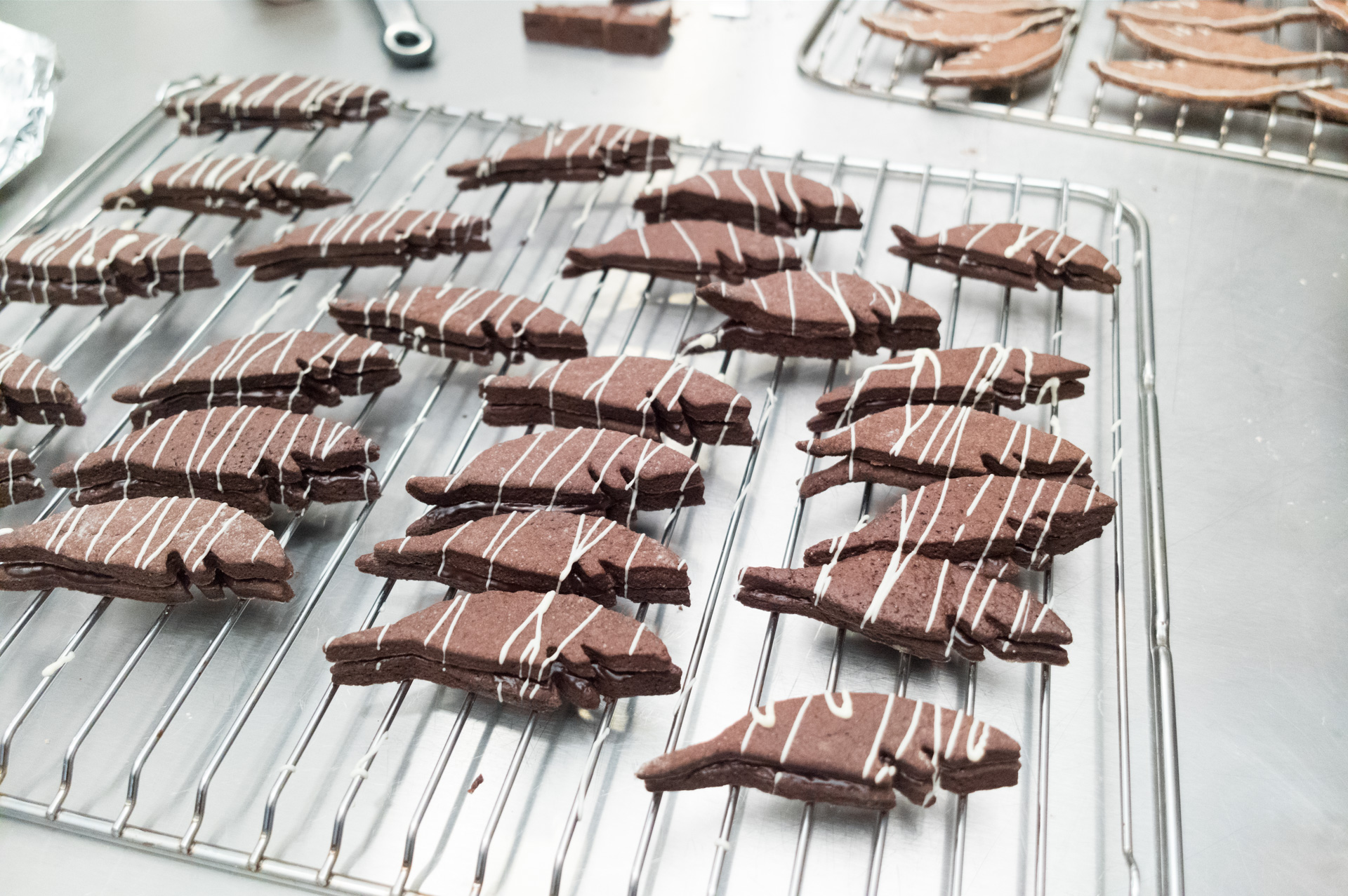 Als ich höre, dass Katrin das Aufräumen und Abwaschen für uns übernimmt, habe ich gleich dopplete Lust auf unseren Backnachmittag. Meine Strategie zuhause ist häufig, möglichst wenig Schüsseln zu verwenden, dann muss ich auch nicht so viel aufräumen. Heute mache ich nach herzenslust die Schokoplätzchen, die mithilfe einer Schokofüllung zu gehaltvollen Doppeldeckerfedern werden. Den Topf mit den klebrigen Resten der Schokofüllung muss ich ja zum Glück nicht abwaschen 😉