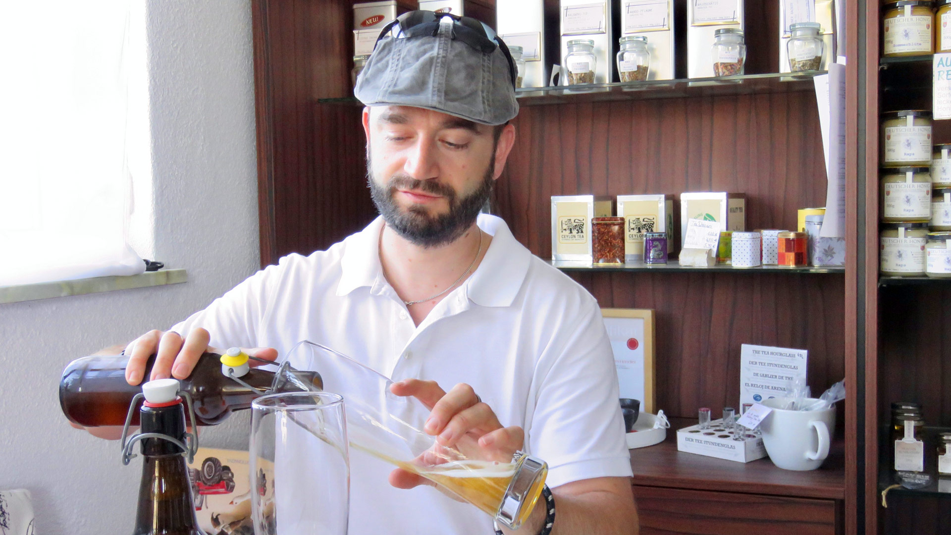 Schließlich kommen wir an der Kellertür an. »Bitte den Kopf einziehen«, warnt er mich, während er mit schnellen Schritten um die Ecke biegt. Schon auf den ersten Stufen rieche ich den bekannten Duft von Bier. »Hier entsteht mein Braukeller«, strahlt Denver Künzer und beschäftigt sich gleich mit ein paar Flaschen, die im Flur stehen. Ein paar Kisten reifen hier in dem kühlen Keller. Denver greift sich eine durchsichtige Probeflasche aus der Kiste und hält sie prüfend gegen das Licht. Das Landbier sieht bereits lecker aus: etwas heller als Waldhonig. Ein Druckmesser zeigt zwei Bar und verrät, dass in den Flaschen alles in Ordnung ist. Ich bedaure, dass die Reifung noch dauert, denn sein Landbier trinke ich besonders gern. Eigentlich wollte er nur ein Bier zum Selbsttrinken haben, von dem er keine Kopfschmerzen bekommt. »Industriebier wird meistens mit Hopfenextrakt gebraut. Damit sich das Aroma auslöst, wird Chemie verwendet, die Kopfschmerzen macht«, fasst er seine Motivation kurz zusammen.