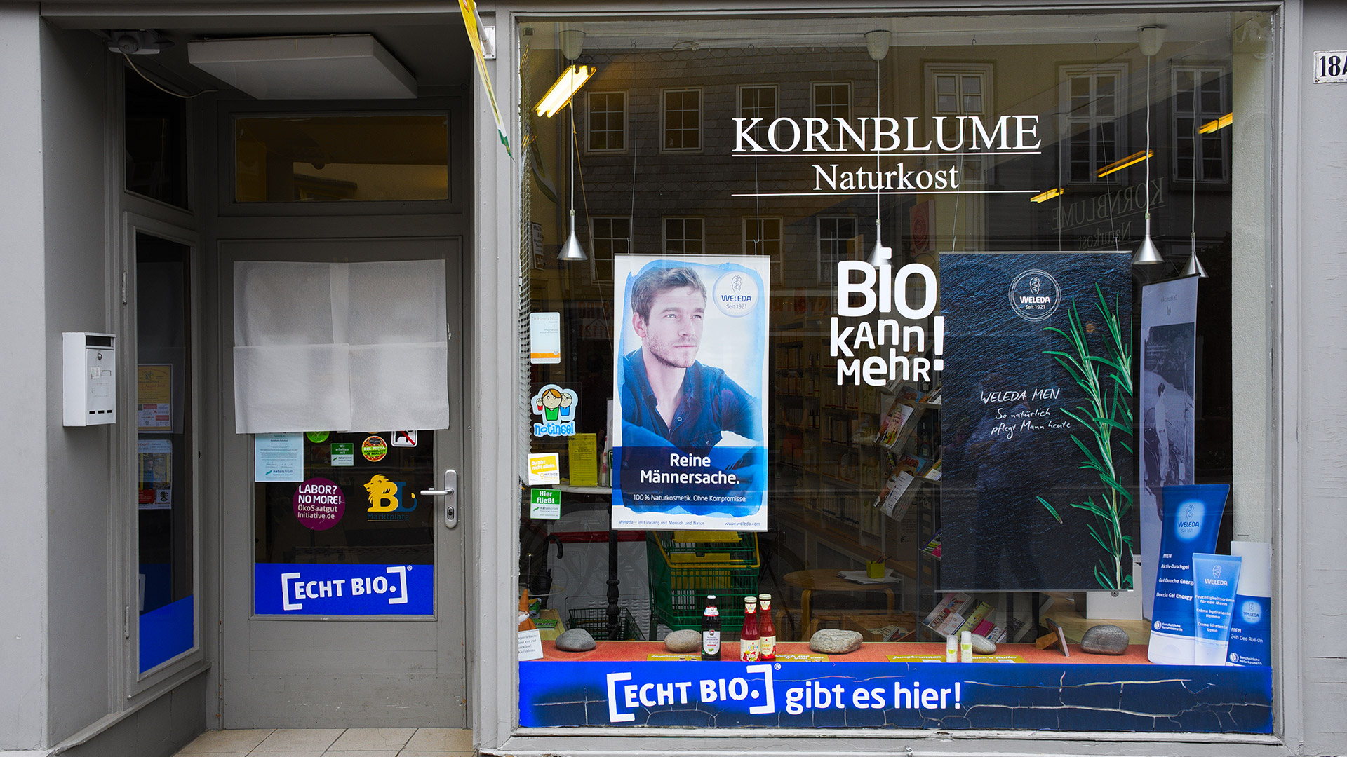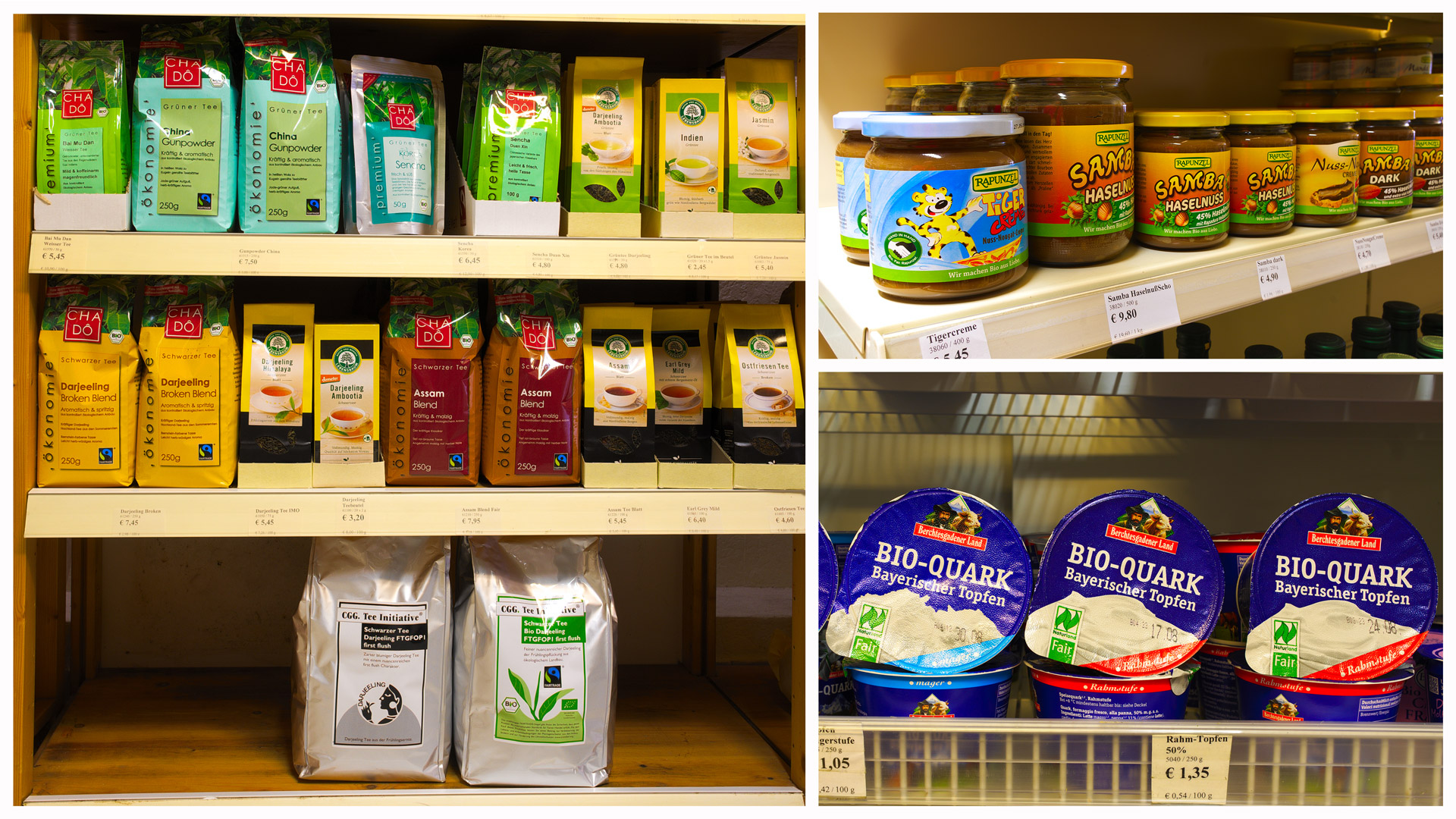 Nun wende ich mich wieder der Langen Herzogstraße zu und schaue ins Reformhaus Bertram hinein. Auch hier geht es schon sehr fair zu. Die fairen Waren, die ich dort finde, sind zum größten Teil der Kategorie „Verführer“ zuzuordnen. Die süßen Angebote dort stellen meine Selbstbeherrschung schon arg auf die Probe. Etliche Schokoladensorten, Kekse, Kakao, Kaffee – hier nur zum Gucken reinzugehen, ist schwer … Aber noch ist mein Weg nicht zu Ende. In einem weiteren Geschäft wollte ich mich noch umsehen. Vom Reformhaus aus steuere ich den Naturkostladen auf der Breiten Herzogstraße an – die „Kornblume“. Das faire Sortiment hier ist ziemlich umfangreich und vielfältig. Natürlich Schokolade, Kaffee und eine schöne Auswahl an Teesorten. Aber auch verschiedene Getreidezubereitungen und Brotaufstriche. Und dann erlebe ich sogar noch eine Überraschung: fair gehandelter Quark aus Deutschland! Dem Molkereiunternehmen, das den vertreibt, geht es u.a. um die Rettung der Kleinbauern in der Milchwirtschaft und gleichzeitig um eine möglichst naturbelassene Milchqualität. Und das Unternehmen erfüllt tatsächlich die Bedingungen für fairen Handel. Wieder was gelernt!