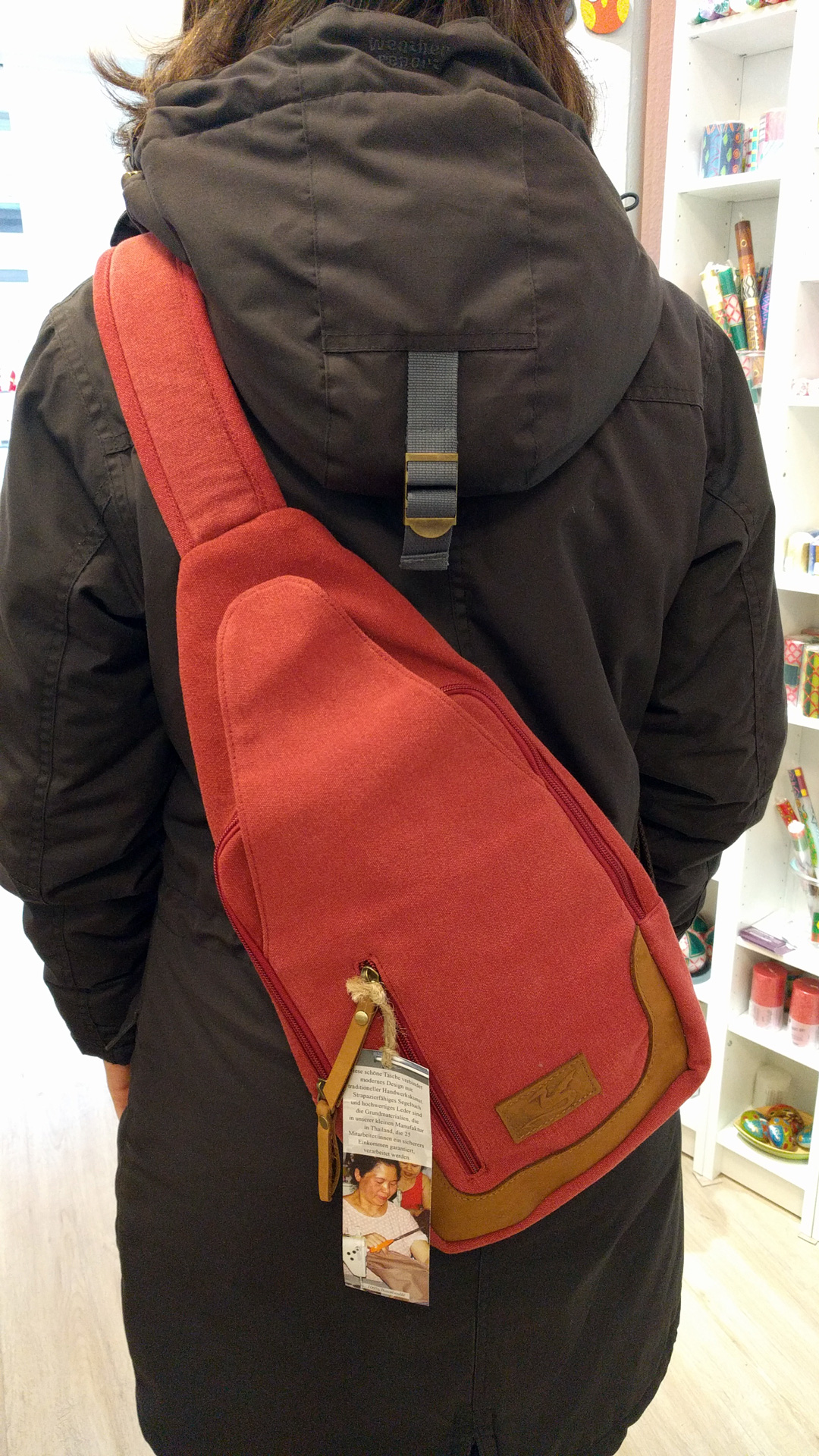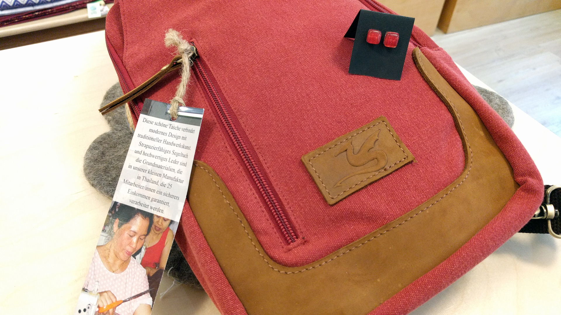 Im Weltladen findet ihr aber nicht nur Kleinigkeiten. Es gibt auch richtig schicke Taschen. Also, Mädels, aufgepasst: Beschenkt euch doch einfach mal selbst. Mich entdeckt ihr vielleicht demnächst mit diesem schönen Rucksack. Die passenden Ohrringe habe ich zumindest schon ausgesucht.