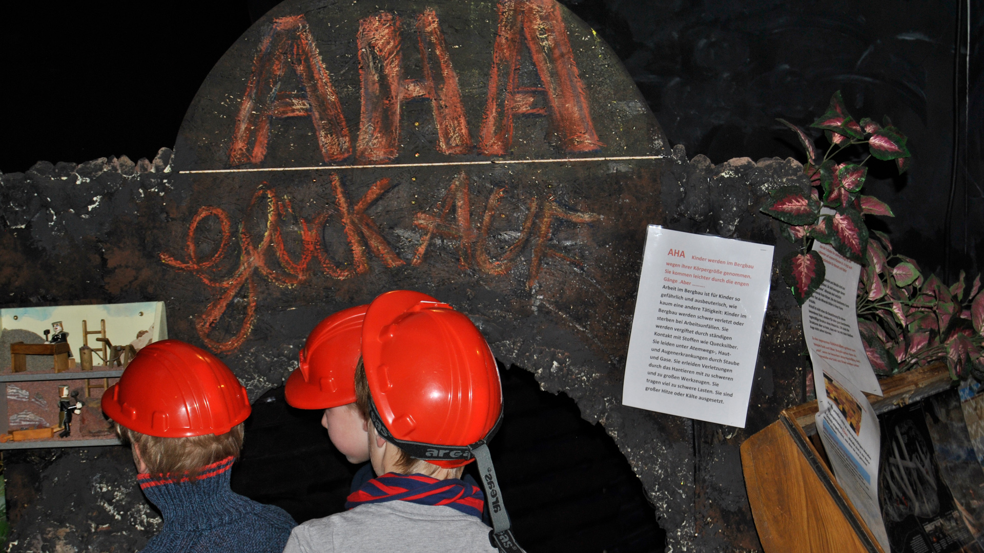 Jetzt zurück zu unserer Reise. Die erste Gruppe geht zum Bergwerk und anschließend in die Wüste. Katrin Keller führt die Gruppe. Für eine Entdeckertour durchs Bergwerk wird die richtige Ausrüstung benötigt: Helm, Stirnlampe und Handschuhe. Dann geht es durch den AHA Stollen tief ins Bergwerk hinein.