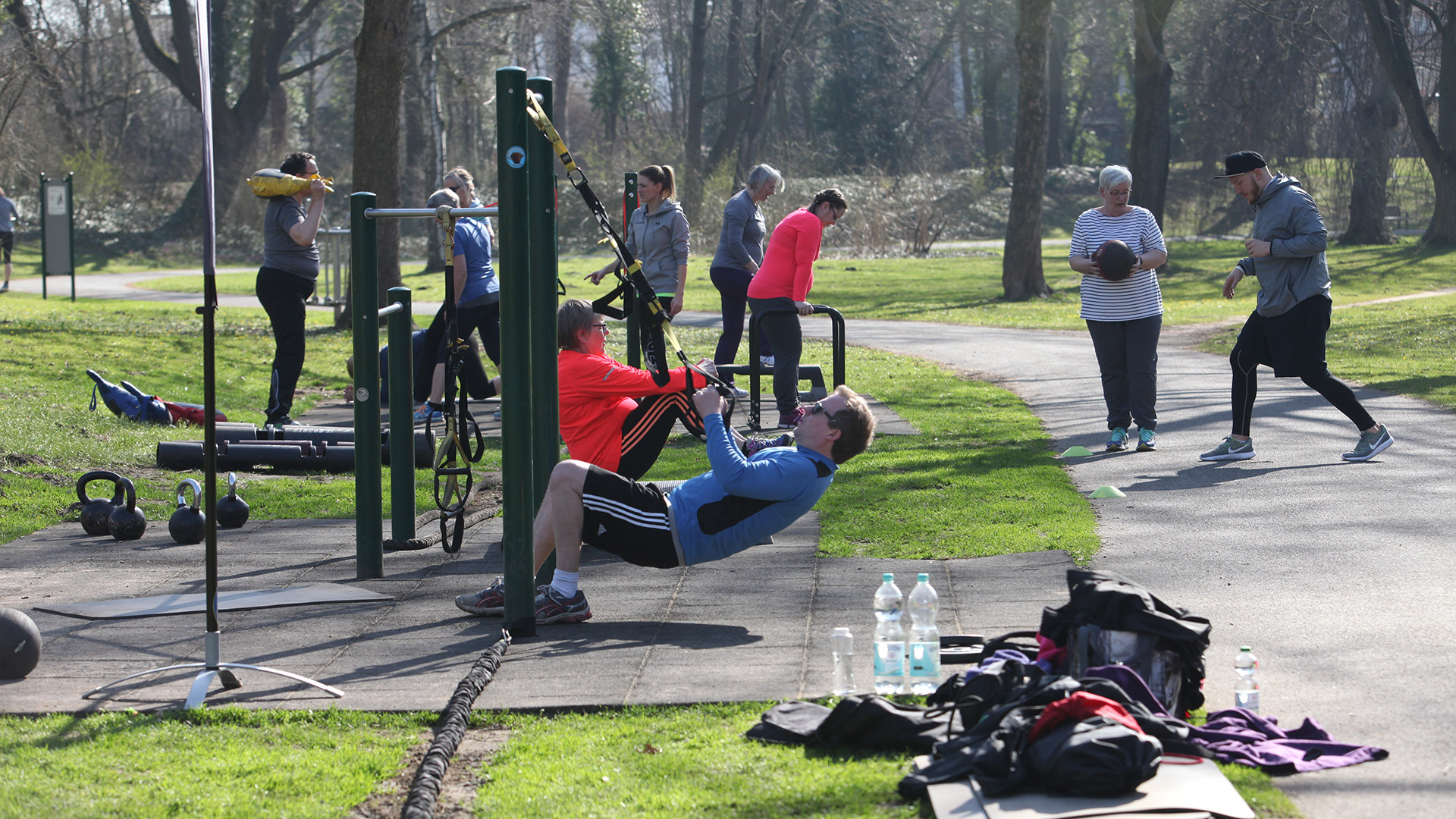 Nach der Runde 1 wird eine kleine Pause eingelegt, alle Teilnehmer trinken etwas und dann beginnt auch gleich Runde 2. Es werden möglichst viele Körperbereiche trainiert und gekräftigt, auch eine Dame konnte nach ihrer Hüftoperation wieder problemlos einsteigen. Joana feuert uns immer wieder an „noch 10 Sekunden, Tempo!“. Und dann ist es geschafft, „letzte Übung“ hallt es durch den Park. Eine kleine Dehnungsrunde gibt es noch zum Schluss, die Teilnehmer klatschen sich ab, „ihr habt es geschafft, vielen Dank“. Der erste Teilnehmer der Fortgeschrittenen Gruppe ist schon da und es geht fast nahtlos weiter. Joana und Thorsten bauen noch schnell um und auch mit dem Beginn des neuen Kurses stellt Joana die einzelnen Übungen kurz vor. Das Training für Fortgeschrittene dauert 60 Minuten und hier kann man sich schon etwas mehr austoben.