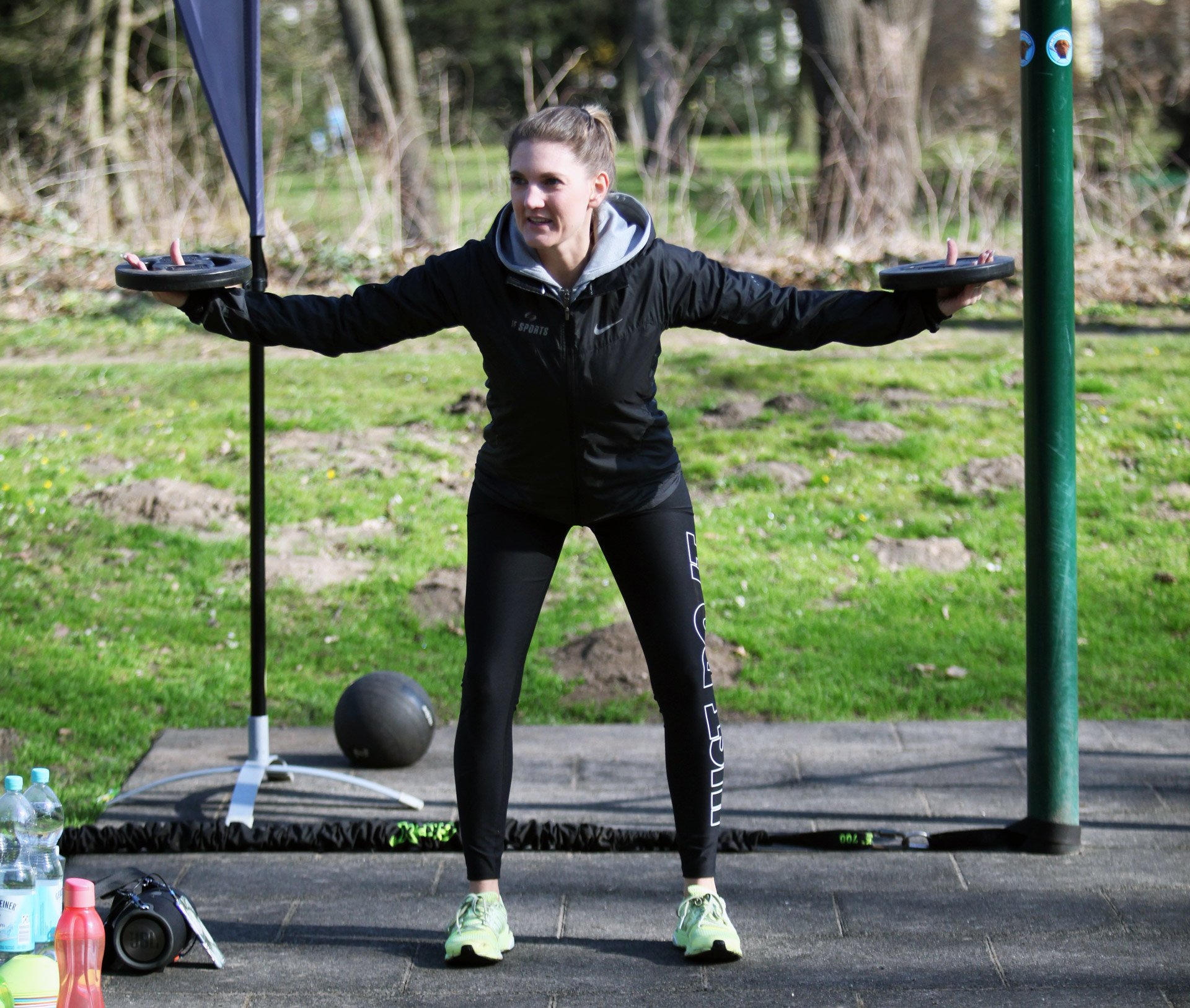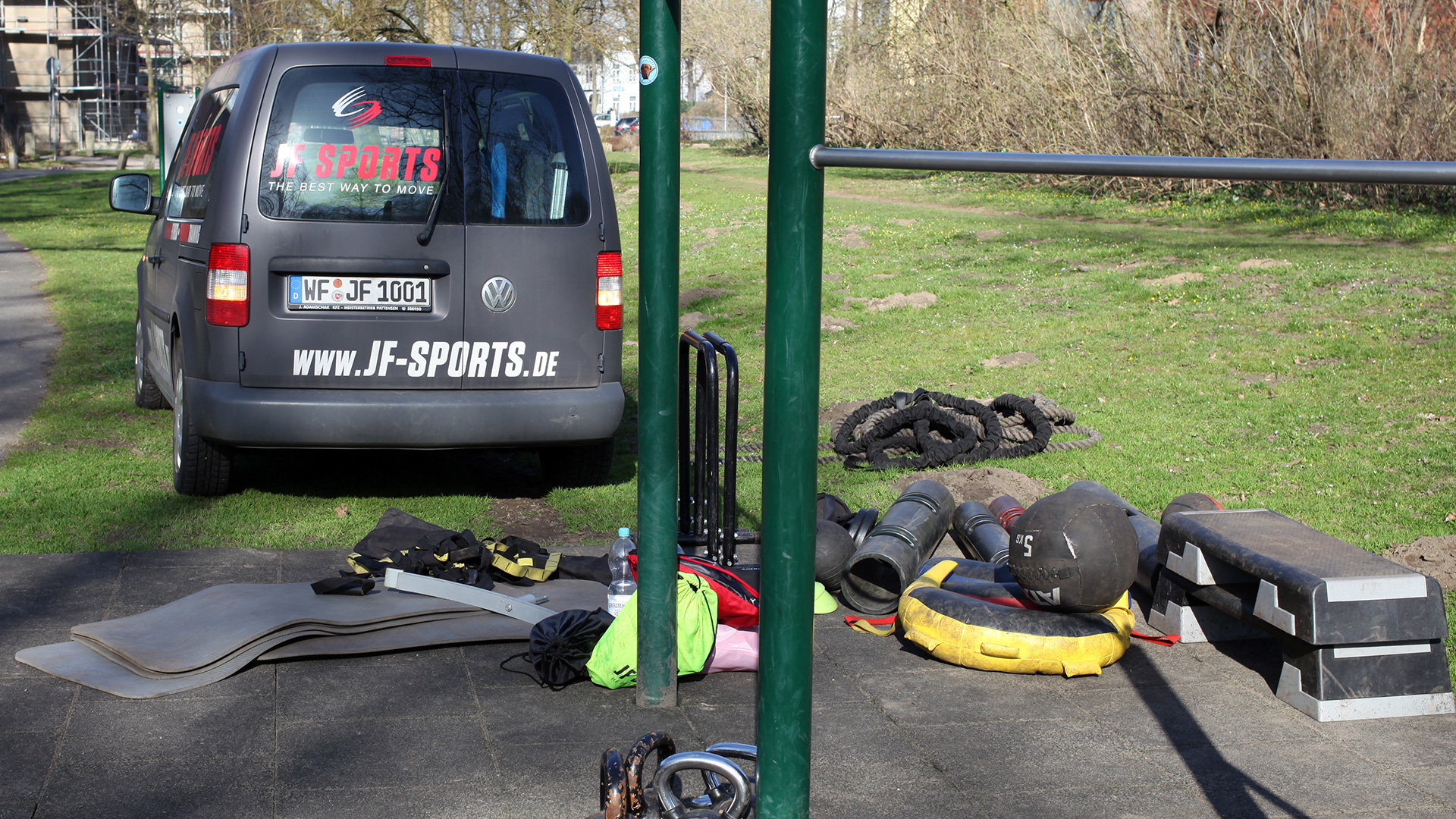 Ich treffe Joana, die schon da ist und gerade die verschiedenen Gerätschaften aus ihrem Auto auslädt. Heute wird sie begleitet durch ihren Mann Thorsten, da Florian im Krankenhaus Dienst hat. JF-Sports legt besonderen Wert darauf, dass beim Training immer zwei Trainer dabei sind, um alle Teilnehmenden auch individuell betreuen zu können.