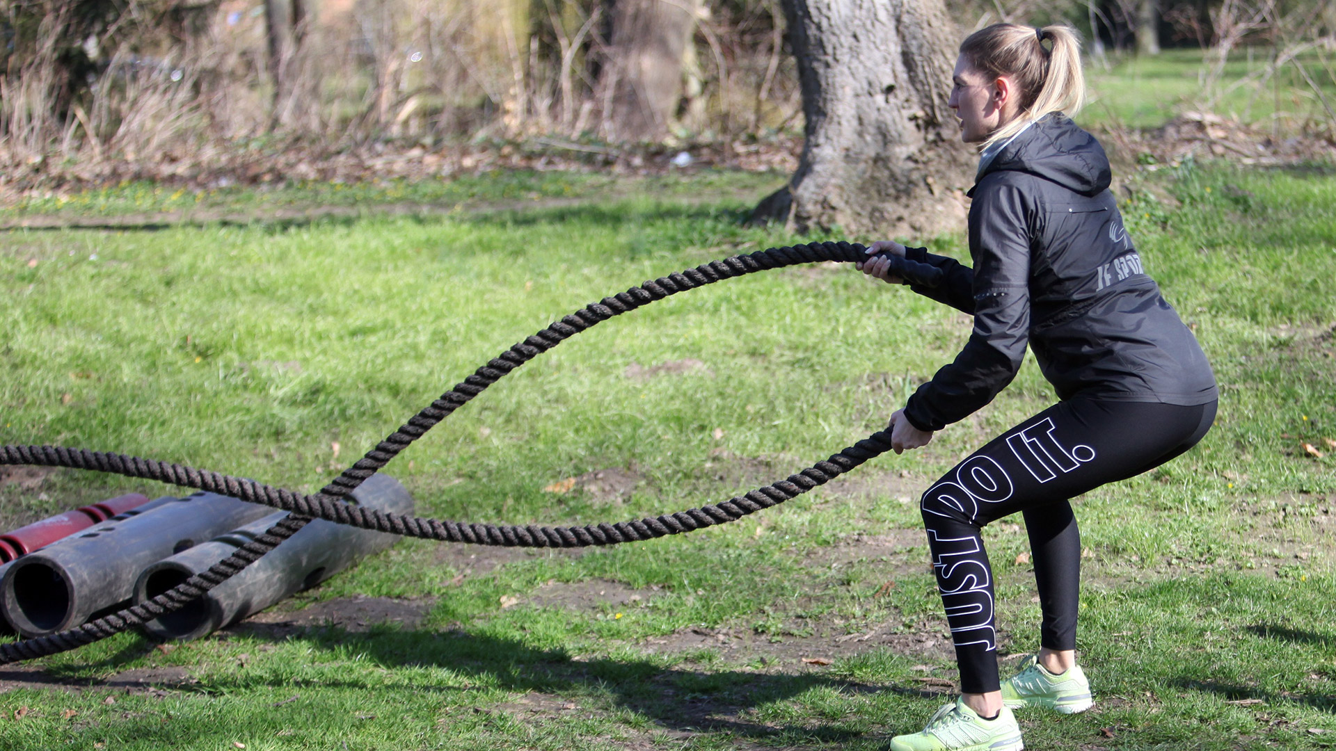 Kaum zu glauben, es ist doch noch Frühling geworden! Der flotte Slogan „Drinnen war gestern, draußen ist heute“ auf der Internetseite von JF-Sports weckt sofort bei mir die Sehnsucht nach Aktivität an der frischen Luft, vor allem nach dem gefühlt unendlich langen Winter. Joana und Florian, das sind die beiden Fitnesstrainer von JF-Sports, verwandeln den Park an den Wolfenbütteler Wallanlagen in ein riesiges Fitnessstudio im Freien. Dieses ist mir beim Radeln durch den Park schon öfters ins Auge gesprungen: Mittwochabends und sonntagmorgens herrscht reges sportliches Treiben an den Gerätschäften des Mehrgenerationenparks. Begleitet durch flotte Musik wird hier in der Gruppe fröhlich trainiert. Am Parcours liegen Seile, Rollen und andere kleine Gerätschaften herum.