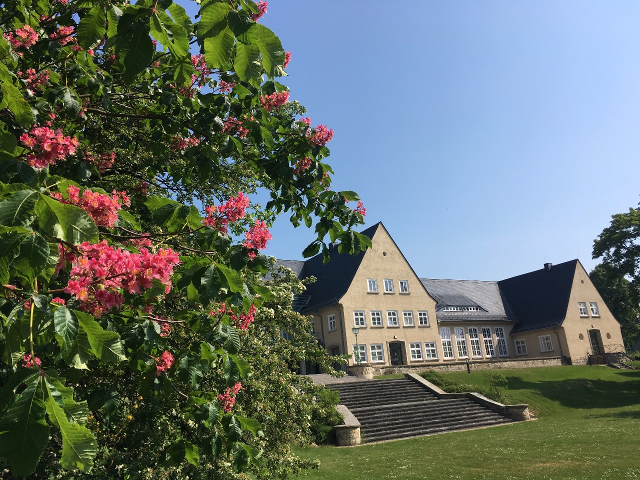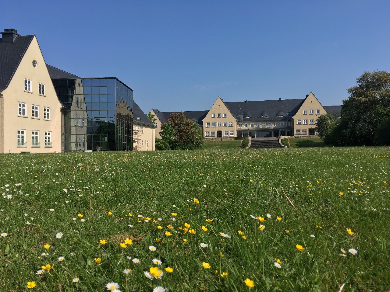 Die Exerzierwiese der ehemaligen englischen Kaserne, dem sogenannten Exer, ist im Sommer mein absoluter Lieblingsplatz für eine kurze Pause auf meinem Hundespaziergang oder für ein Picknick mit Freunden. Das Gelände liegt nordöstlich von der Innenstadt am Rande des Lechlumer Holzes. Die große Wiese wird von den Wohnheimen der Ostfalia und dem imposanten Glasbau der Fakultät Soziale Arbeit eingerahmt. Über die Einfahrt von der Salzdahlumer Straße gehe ich als Fußgänger gerade aus durch einen großen Torbogen direkt in den grünen, weitläufigen Innenhof. Von hier habe ich einen fantastischen Blick auf das ehemalige Kasino, die heutige Hochschul-Bibliothek, am anderen Ende der Wiese.