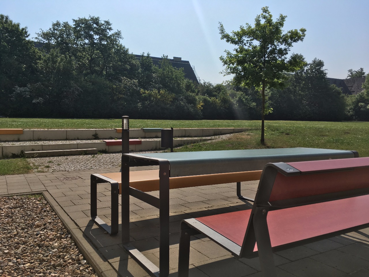 Die bunten Sitzmöbel vor den Gebäuden sind belebte Treffpunkte – nicht nur bei den Studenten! Dort treffe ich immer wieder Gruppen jeglichen Alters. Bei gutem Wetter wird hier gerne gegrillt und zusammengesessen. Für Familien empfehle ich unbedingt einen Besuch des angrenzenden Umweltgartens der Ostfalia: Streuobstwiese, Teich, Insektenhotel und Kräutergarten zeigen uns, wie ökologischer Gartenbau funktioniert. Hier gibt es immer etwas Neues zu entdecken: ein neuer Bienenkasten, ein neues Rhababerfeld oder neue Tomatenpflanzen…