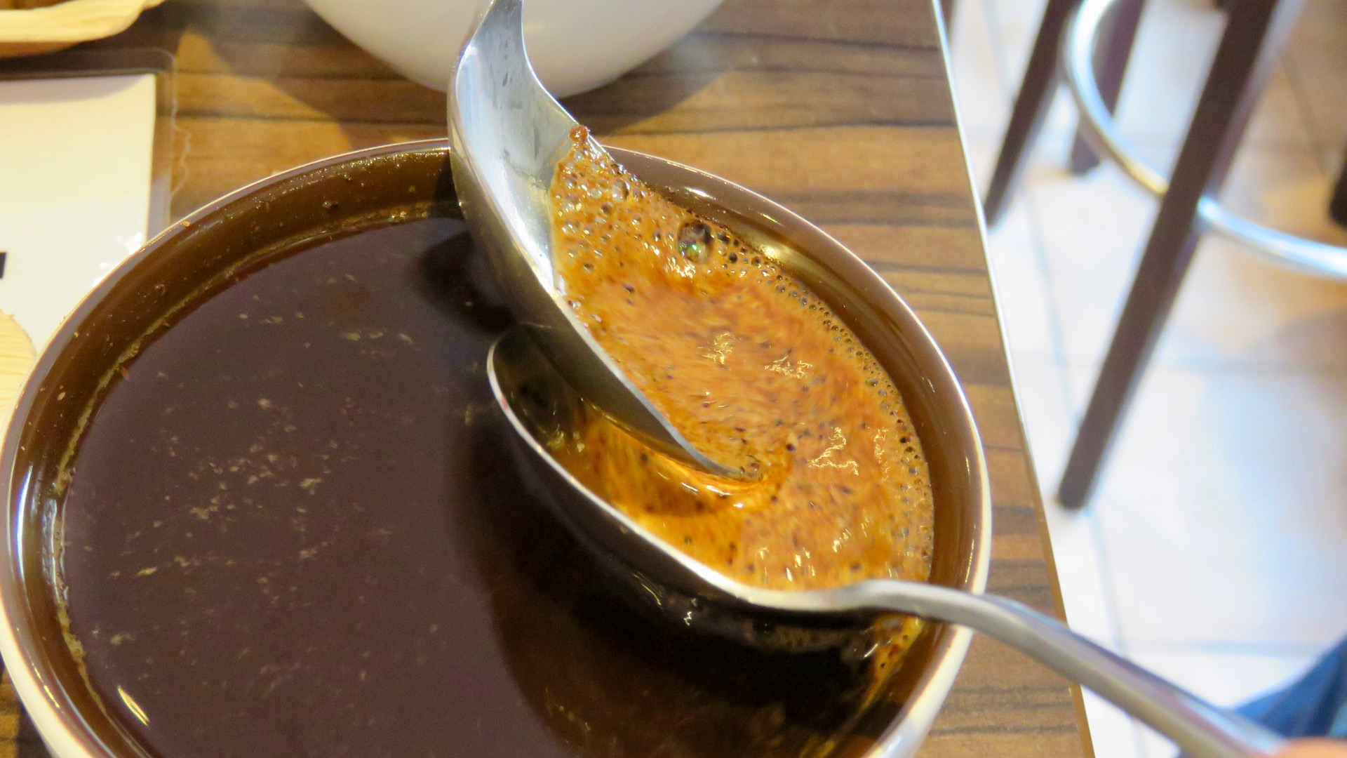 Inzwischen ist die Temperatur unserer Kaffeeproben auf die gewünschten 50 Grad abgekühlt. Die Temperatur wird mit einem elektronischen Gerät gemessen, ohne die Flüssigkeit direkt zu berühren. Es erinnert mich ein bisschen an einen Laserstrahl aus der Serie »Star Wars«. Ein kurzer Ton und die Temperatur wird genau angezeigt. Vorher haben wir die verschiedenen Kaffeeproben »beschnuppert«: Erst das Kaffeemehl und dann den aufgegossenen Kaffee mit Kruste. Mit geschickten Händen und zwei Löffeln tragen die beiden Inhaber die Kaffeekruste ab und endlich geht es zum Verkosten – mit Löffeln und lautstarkem Schlürfen. Es geht dabei um die Vergrößerung der Oberfläche um die Geschmackseindrücke zu verstärken.