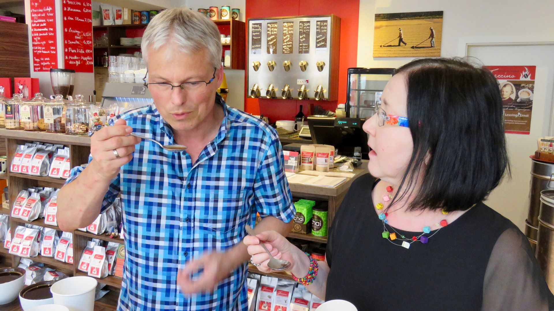 Beim Aufbrühen ist schon die Wassertemperatur für den Geschmack entscheidend. »Kaffee darf auf keinem Fall mit kochendem Wasser aufgegossen werden, dann wird er bitter«, klärt mich Andreas Steinig auf, während wir geduldig einen Moment abwarten. Ich stelle fest, dass Geduld und Genuss hier unbedingt zusammengehören. Dann gießen beide gleichzeitig warmes Wasser in die Schälchen und wirbelt das braune Pulver auf. Jetzt wird wieder gewartet. Ich lerne, dass sich bei etwa 50 Grad die Aromen am besten entfalteten.