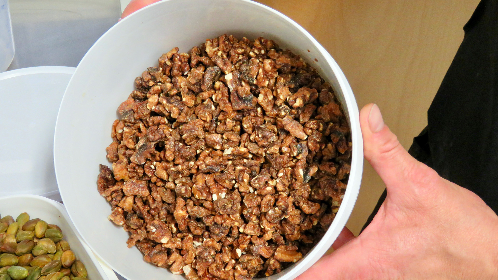 »Statt einem Snickers-Eis gibt es bei uns ein Erdnuss-Eis, für das die Nüsse selbst geröstet werden«, freut sich Jörg Borkowski. Oft bringen Kunden besondere Dinge, wie etwa Wildmirabellen oder Trauben, zur Verarbeitung vorbei. In unserem Gespräch über seltene Früchte, Nusspasten oder die kolumbianische Zitrusfrucht mit dem klangvollen Namen Lulo, bekomme ich allmählich selbst Appetit auf ein Eis. Ich mache noch ein paar Fotos in der Küche und darf noch die Eismasse des Paranuss-Eises probieren, bevor sie in die Eismaschine kommt. Diese Sorte hat in der »Wolfenbütteler Eismanufaktur« in diesem Jahr Premiere. Ich finde, dass die flüssige Masse köstlich schmeckt.