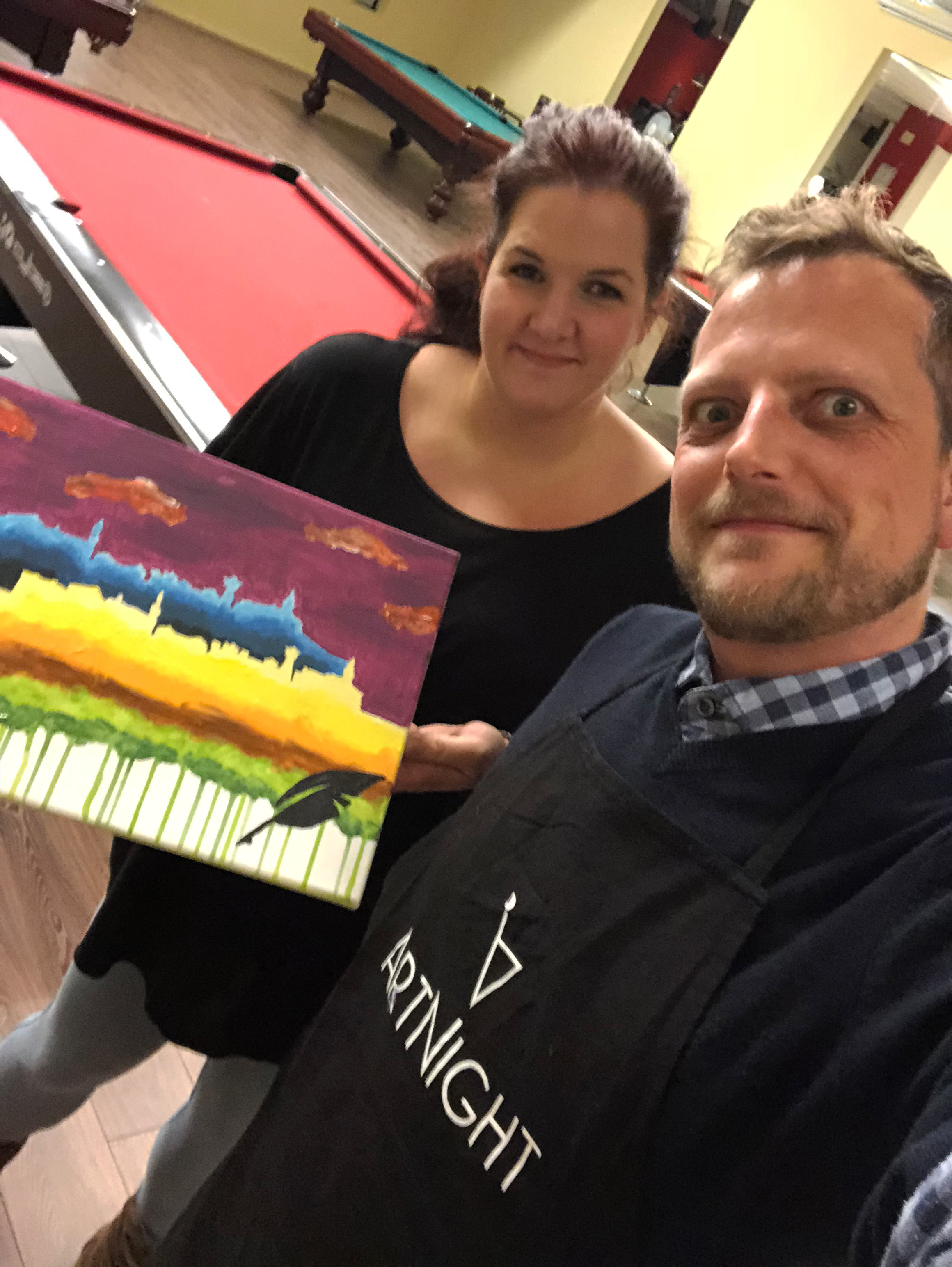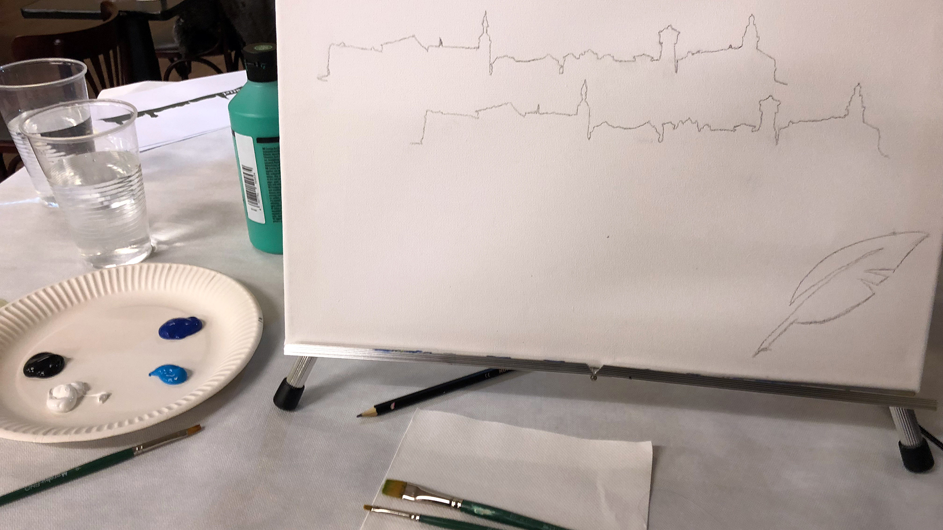 In einer ruhigen Ecke in der Bowling Base treffe ich auf Nina Schönian-Soellig – meine Künstlerin, die mich „an die Hand“ nimmt. Auch die anderen Teilnehmer sitzen an ihren Plätzen. Insgesamt sind wir zu sechst. Alles ist bestens vorbereitet: Vor uns steht eine Staffelei mit Leinwand, jeder hat mehrere Pinsel und viele Farben auf dem Tisch. Bevor wir starten, binden wir uns alle stolz unsere „ArtNight-Schürzen“ um – schließlich sollen die Klamotten vor unschönen Farbspritzern geschützt werden. Nach einer kurzen Einführung, wie man am besten mit den Acrylfarben umgeht, dürfen wir starten. An der Staffelei ist eine kleine Taschenlampe befestigt, so kann ich die Silhouette der Stadt mit Bleistift auf die Leinwand abpausen. Meine brillante Idee: Ich werde zwei Silhouetten der Skyline übereinander auf die Leinwand bringen – schließlich möchte ich ein ganz individuelles Kunstwerk zaubern.